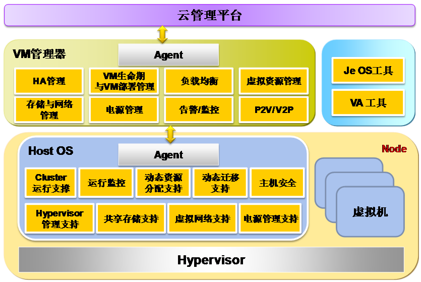 与Hypervisor组件一起为虚拟机管理提供支持。主要功能有为虚拟机提供网络、块设备I/O支持;辅助云弹性计算系统管理工具实现对Hypervisor、虚拟机的控制、监控等功能,如:虚拟机启动、停止、迁移等。 |